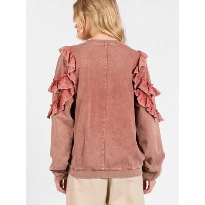 Womens Casual Sweatshirt Romantic Chic Ruffled Sleeve Detail Pullover Top Round Neck Long Sleeve Relaxed Fit Dusty Rose Washed Effect Weekend Loungewear Spring Fall Streetwear