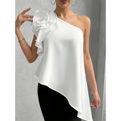 Women'S Elegant Loose Fit Asymmetrical Neck Polyester Ruffle Shirting Top