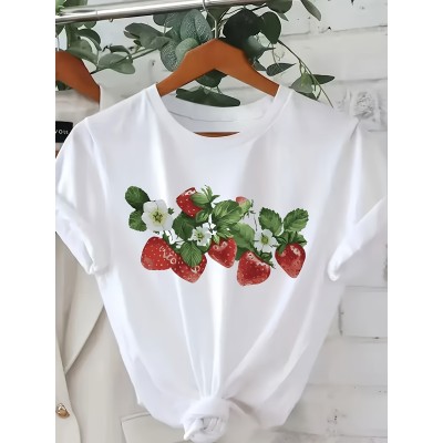 A String Of Strawberries - Pattern Print - Round-neck Casual Short-sleeved T-shirt - Fashionable Women'S Clothing